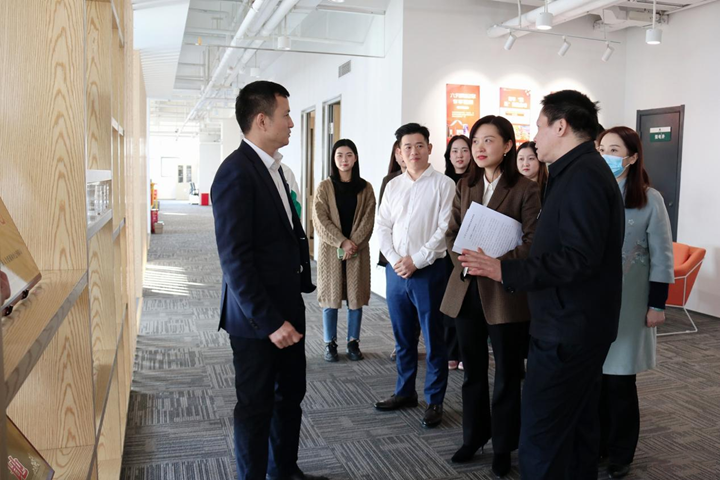 在升职猫董事长陈贤亮、CEO沈刚的陪同下,严区长一行领导参观了公司展厅,了解了升职猫通过不断加强员工技能提升促进企业成长的发展经历,以及人才建设方面取得的成绩。严区长认真听取了介绍,并参观了升职猫文化发展背景墙,党建工作发展历程,对升职猫档案服务行业的发展规划、企业发展的最新战略、公司的综合实力、人才建设的成绩给予了高度肯定。